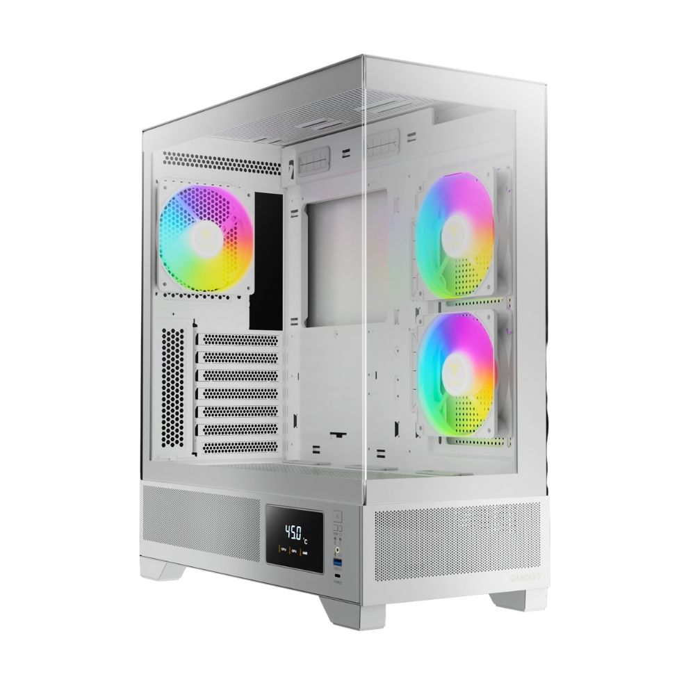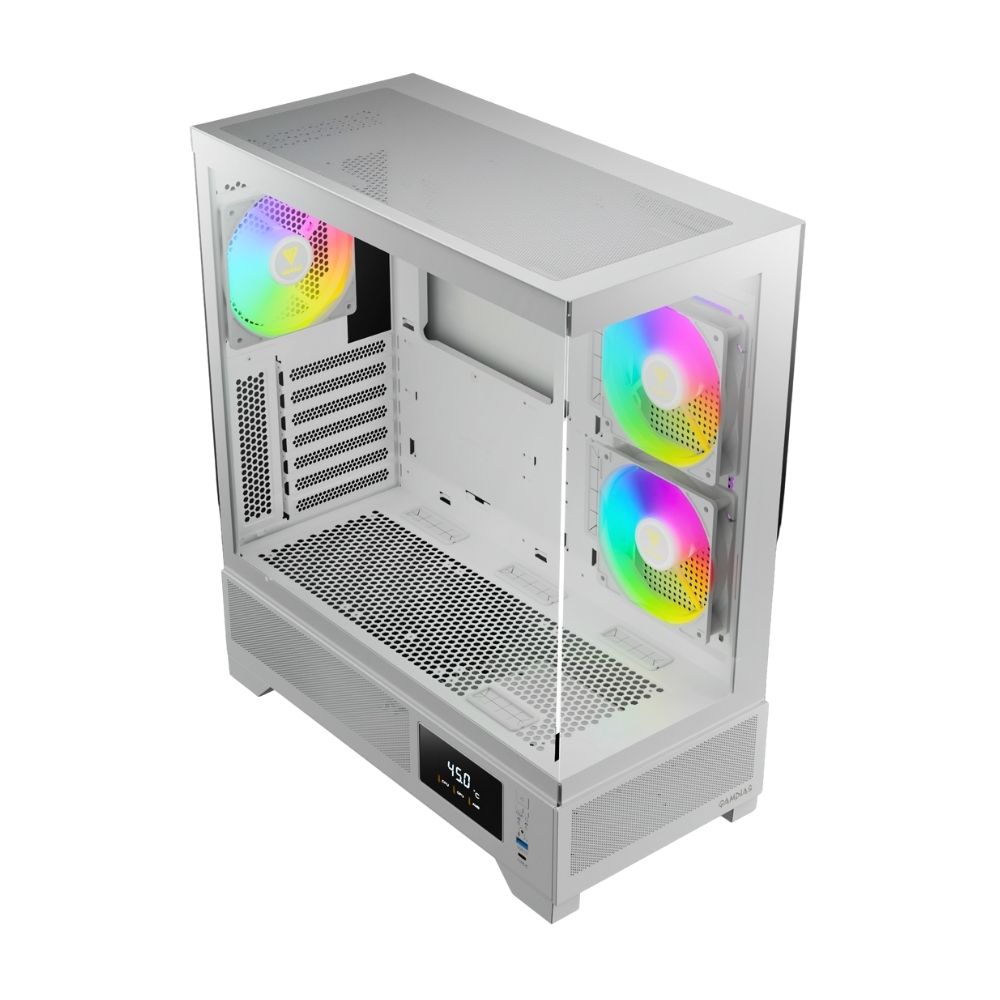 The ATLAS M1 Series is available in black and white editions. The case features perforated air vents with three built-in ARGB PWM fans for optimal airflow and a customizable monitor for real-time system information. Enjoy the benefit of seamless tempered glass panels providing stunning visuals of your build.