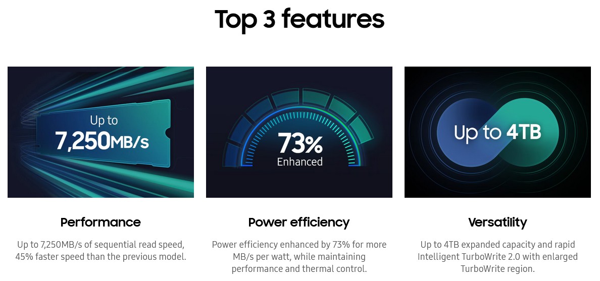 Blast through tasks faster. 990 EVO Plus with the latest NAND offers boosted sequential read/write speeds up to 7,250/6,300MB/s. Huge files,